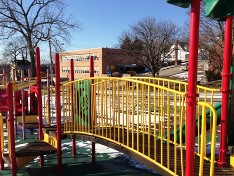 Bon Air Parklet – pavilion in the foreground with a tennis court/dek hockey rink in the snow-covered fenced-in area