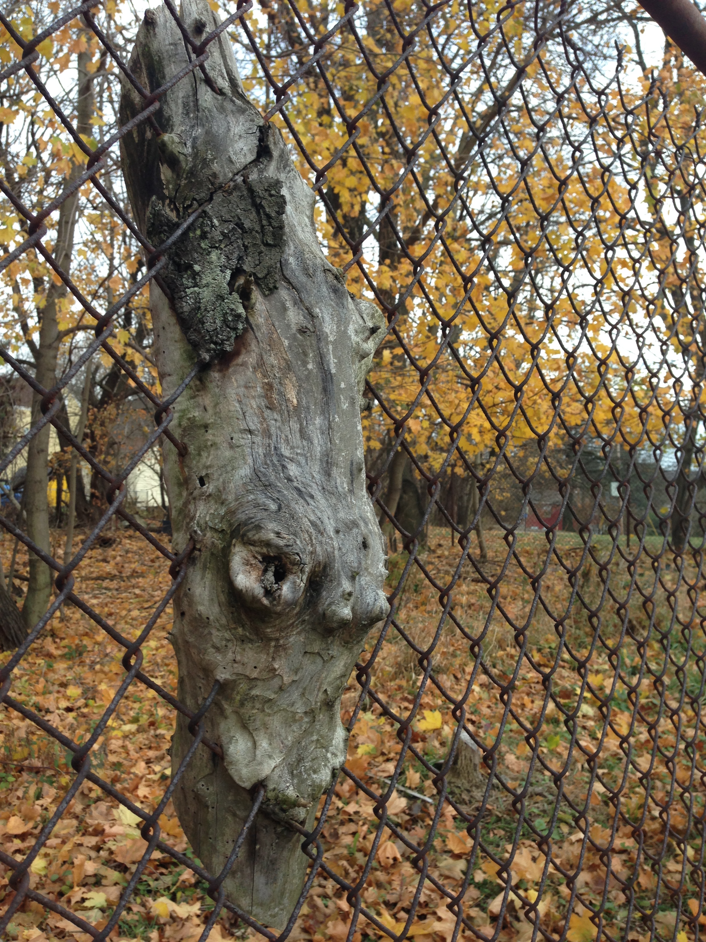 Just around the corner from the entrance to Zaruba, near where we parked, was an interesting street called Syrian St.  Another fence contained a tree-filled lot of land, perhaps private backyards of the aforementioned standalone homes, along Syrian St.  As we walked we were struck by the curious wedging of tree bark within the chain-link fence.  It was as if the wood had grown since its beginning around the links.