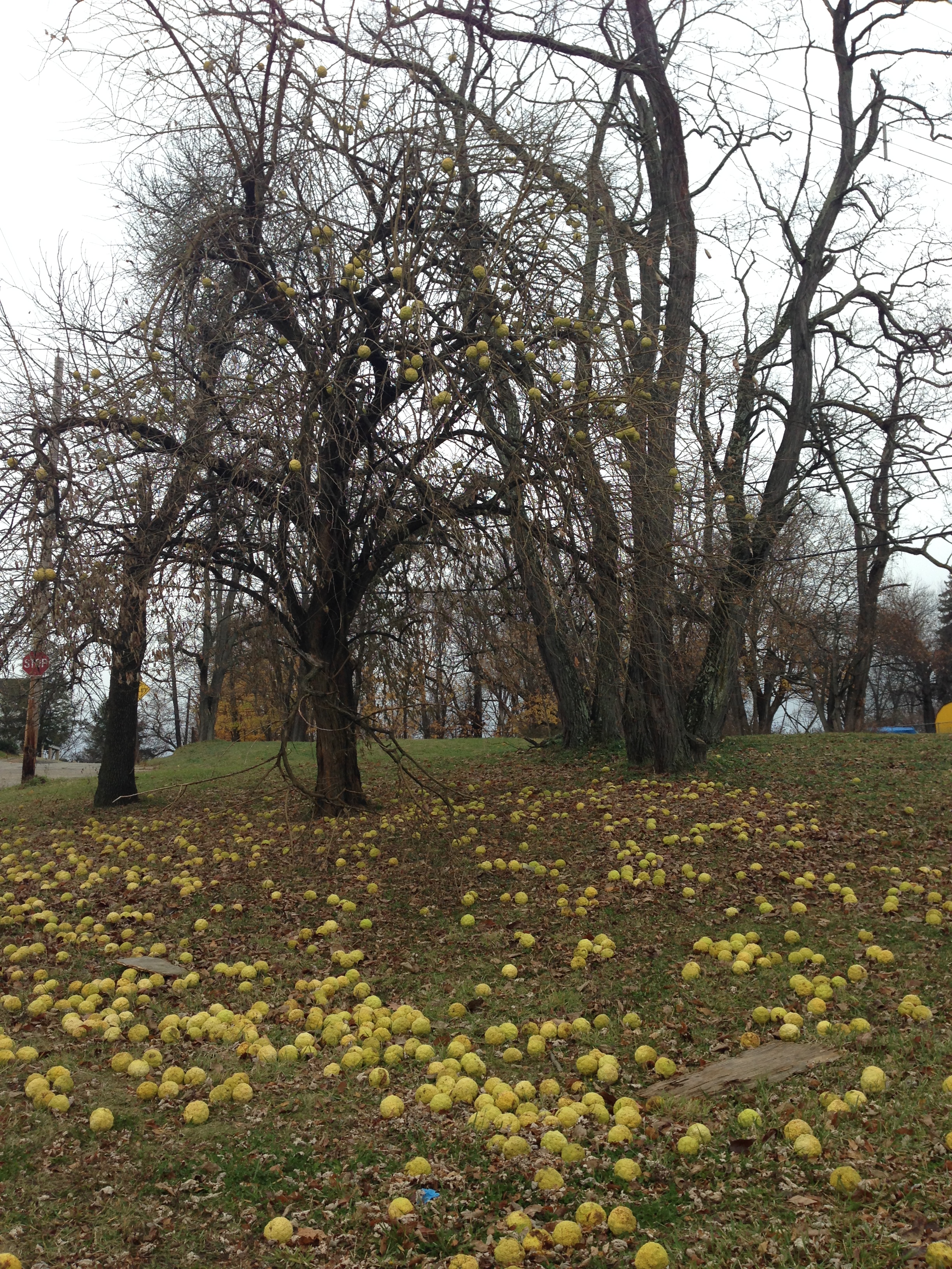 Next, we headed back up the stairs of Syrian St. toward the car.  We reached the intersection of Syrian St. and Devlin St. when Kim’s mouth dropped in utter puzzlement while Derek looked on with delight.  In a small triangular patch of grass stood a few trees, mostly barren, and on the ground around them were bocce-ball-sized, alien-baby-looking, green things.  Derek shouted “monkey balls!”  and remembered the trees from his childhood that grew these huge ugly fruits. The trees grew along the banks of the Kiskiminetas River and, one time, as a child (don’t tell his mom), he was invited by his elder neighbor to shoot the tree’s fruit down with a homemade slingshot.  It was a one-time lesson and no monkey balls or children were injured during the session.  Also, residents of Arlington Heights, please note that these suckers – technically Osage oranges – are not edible!